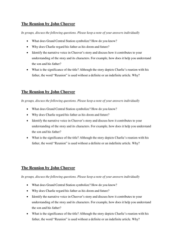 Was his memory failing or had he so disciplined it in the repression of unpleasant facts that he had damaged his sense of the truth? —from 'the swimmer (1964) by. In reunion by john cheever we have the theme of disappointment, connection, identity, separation, regret and alcoholism. The novel remains for me one of the few forms where we can record man's complexity and the strength and decency of his longings. The stories of john cheever , michiko kakutani wrote in cheever's 1982 obit, was one of the few collections of short fiction ever to make.