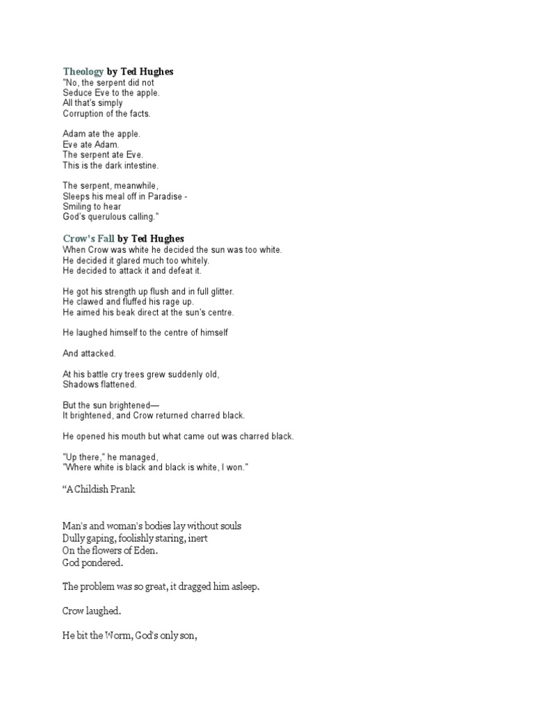 It heralds the ambitious second phase of his hughes describes several of the poems, particularly 'lovesong', 'the lovepet' and 'bride and groom. Ted hughes is consistently described as one of the twentieth century's greatest english poets. His early life was marked by his father's experience as one of the few soldiers to survive the british battle at gallipoli during world war i. The crow poems are mythological and parody the bible.