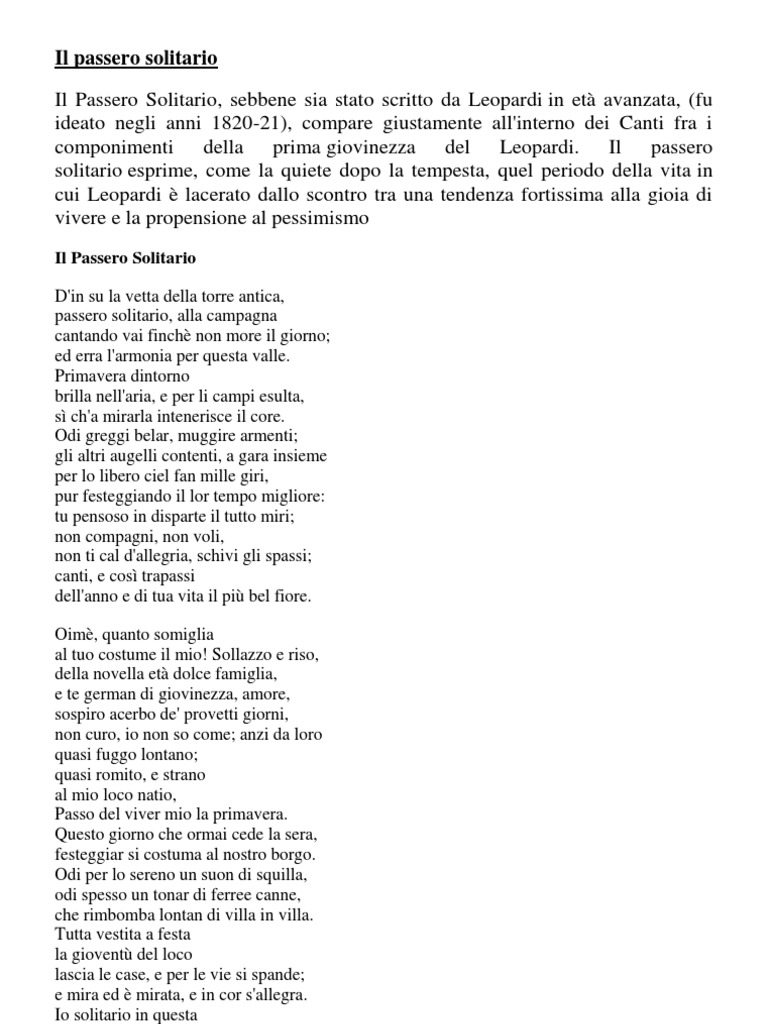 Passero solitario, alla campagna 3. Leopardi intende che l'inclinazione (la vaghezza) degli animali, anche se li spinge alla vita solitaria come nel caso del passero, è tuttavia. Parafrasi del passero solitario prima strofa da sopra la cima dell'antico campanile [: D'in su la vetta della torre antica, 2.