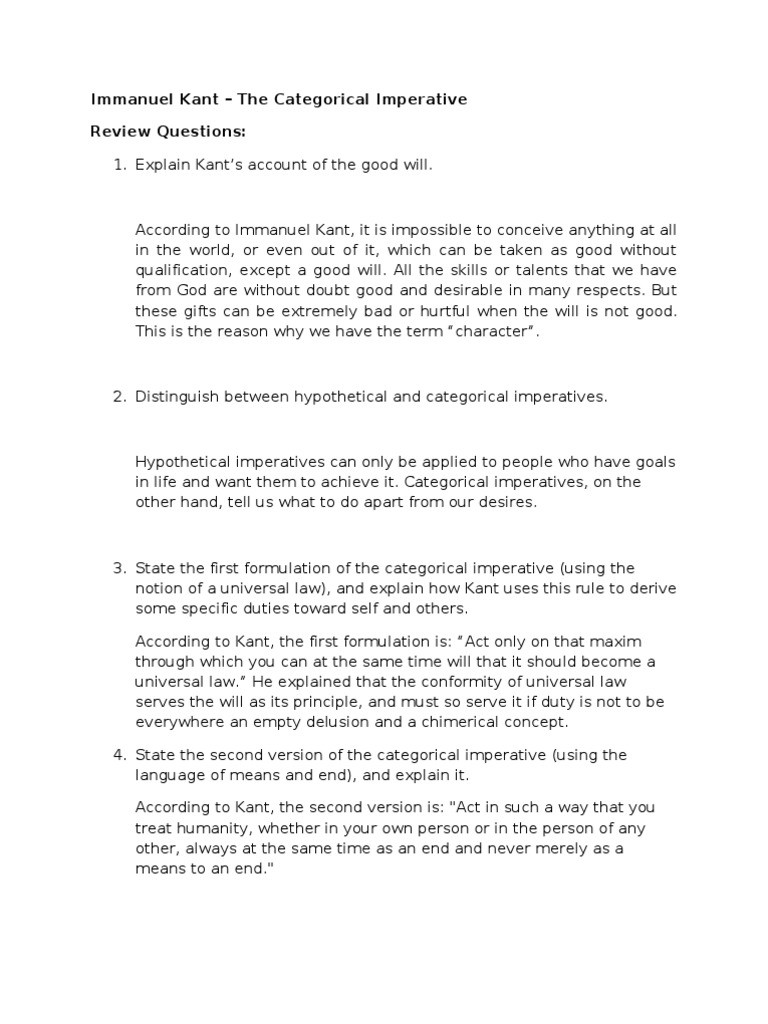 Kategorischer imperativ) is the central philosophical concept in the deontological moral philosophy of immanuel kant. Having presented his view on how and why something may be considered moral, the issue of examination caps the end of his view in this section. It expresses the moral law as ultimately enacted by reason and demanding obedience from mere respect for reason.
